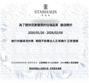 🚧🚧To provide you with a better accommodation experience, the hotel will be undergoing exterior cleaning from 8:00 AM to 6:00 PM, January 26, 2025 to February 8, 2025. The lobby entrance will remain operational during the cleaning period. Please be careful as the corridors and nearby roads may be slippery. We apologize for any inconvenience.